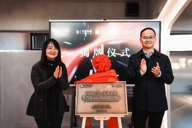 李罗娜、冯涛共同为“江南大学×艾沐柒柒 | 数智化家居设计研究中心”揭牌。